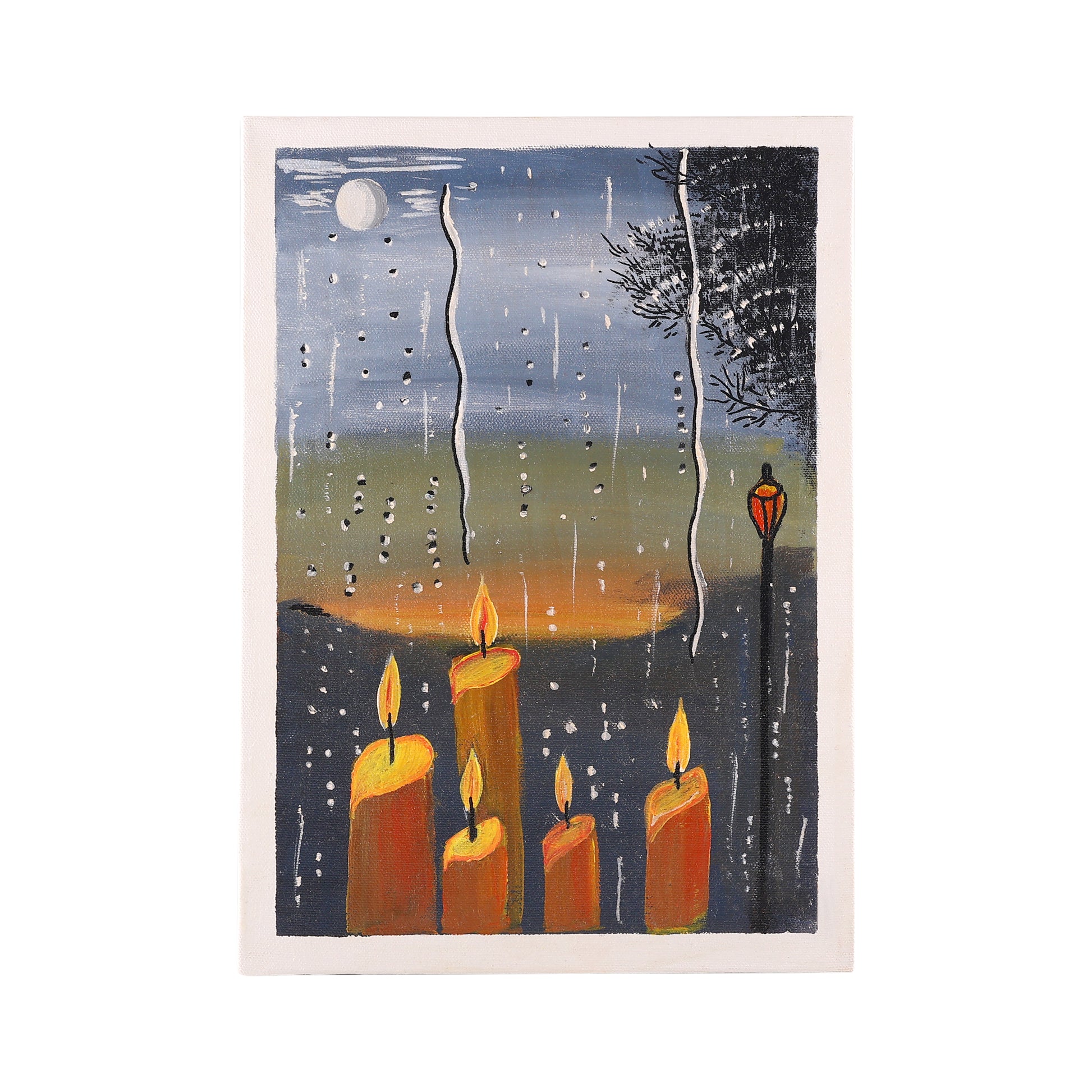 This hand-painted acrylic artwork captures the soft glow of candles flickering in the rain beneath a moonlit sky. Perfect for adding warmth and calm to bedrooms, hallways, or cozy corners.